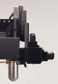 Das Objektiv kann sowohl in X, Y und Z verschoben als auch um die X-Achse gedreht werden. Zwei bewegliche Spiegel ermöglichen es dem Mikroskop, das Anregungslicht unabhängig von Bewegung oder Ausrichtung effizient zur hinteren Apertur des Objektivs zu leiten. Die verwendeten X-, Y- und Z-Bewegungen sind die gleichen wie beim Mikromanipulator Sutters MP-285, so dass Sie wissen, dass die Bewegungen glatt, feinskalig, driftfrei und hochgradig reproduzierbar sind. Diese Bewegungen ermöglichen die Aufnahme von Z-Stapeln und Mosaikbildern großer Geweberegionen, ohne dass ein beweglicher Tisch erforderlich ist.
