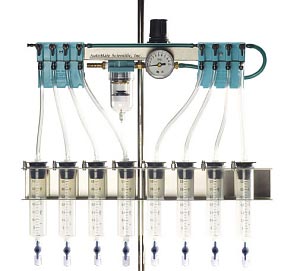 Easy to add to any new or existing gravity perfusion system from AutoMate Scientific, any third-party manufacturer, or even homemade rigs.  Connect to house air or compressor (30 to 100 psi).  Does not introduce bubbles into solution; helps overcome flow problems due to bubbles.  Available in four-, eight- or sixteen-channel configurations.  Syringe reservoirs may be placed in a water bath for temperature control.  Elegant design allows individual control of each air line.