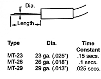 MT – 4   Similar to MT-29/1 but has blunt tip.  Good for instant skin and surface temperatures, liquids. Time constant  0.025 s.  Not isolated.  All above probes are non-isolated.  Isolated versions of 23 ga. and larger needles are available for special order.